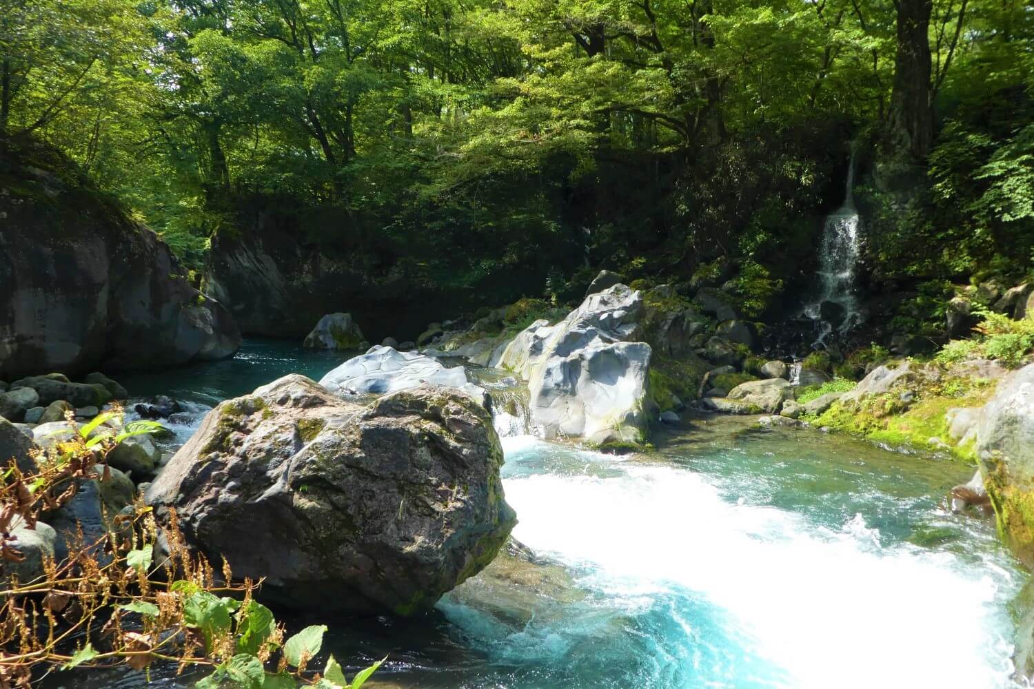 Eenmaal de rivier overgestoken lijk je in een andere wereld te zijn gekomen. In ieder geval een rustige wereld, want veel mensen komen hier niet. 7000 jaar geleden ontstond deze kloof toen de berg Nantai aan het uitbarsten was. Het was tevens de laatste keer dat deze 2484 meter hoge vulkaan dat zou doen.