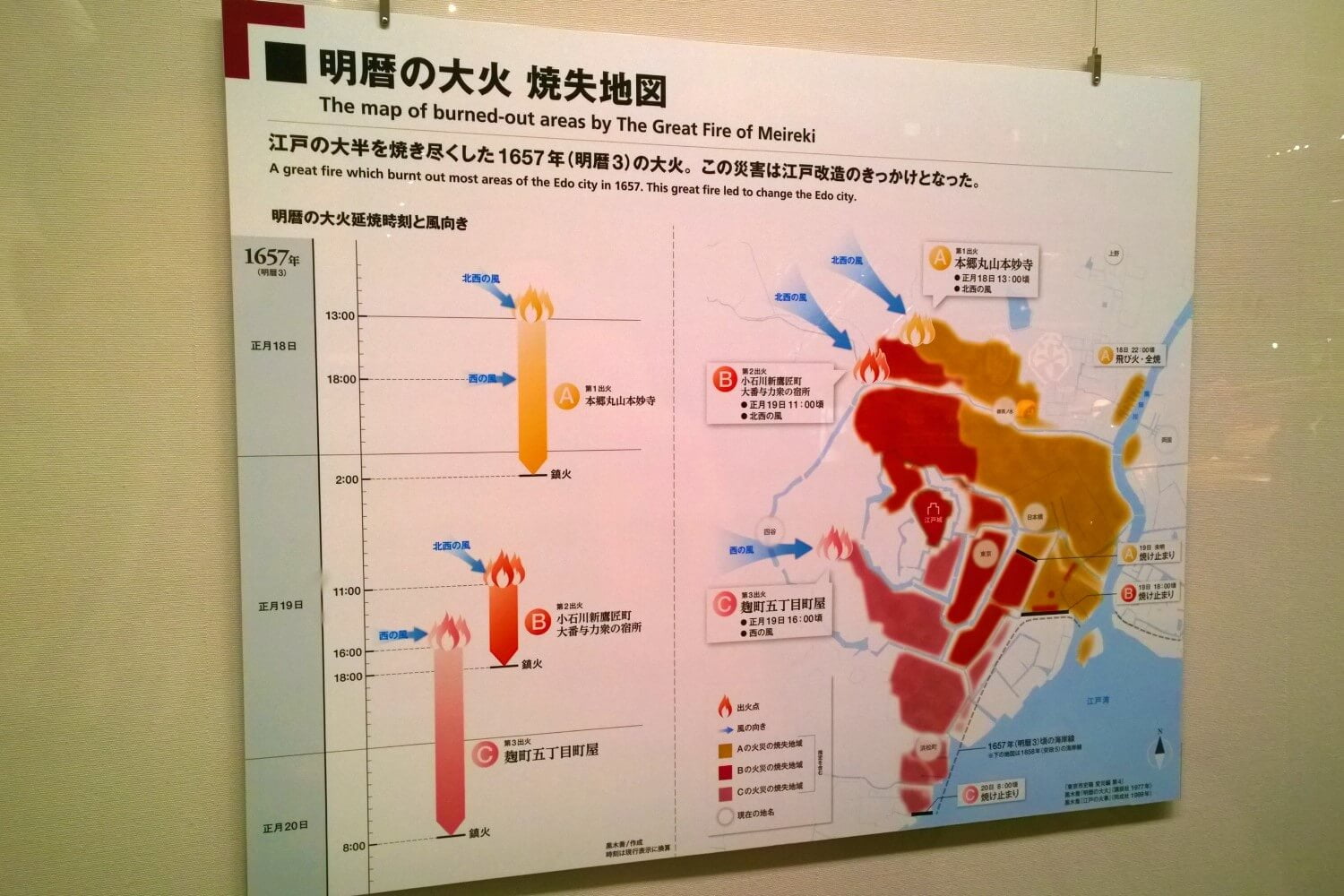 Een van de grootste rampen van Edo/Tokio vond plaats in 1657. Deze staat bekend onder de Meireki Brand. Op dat moment woonden er 300.000 mensen in de stad, waarvan naar schatting 100.000 inwoners omkwamen.